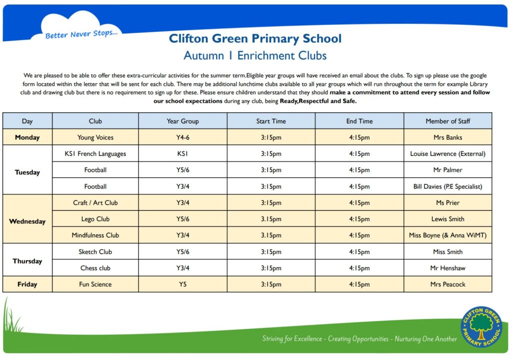 At Clifton Green Primary School, we believe in creating opportunities for every child to explore their interests, develop new skills and have fun beyond the classroom. Our after-school clubs run each half term for six weeks, offering a wide range of exciting activities to suit all ages and interests — from sports and creativity to teamwork and discovery. These clubs are a fantastic way for children to try something new, build confidence, and connect with others in our school community.